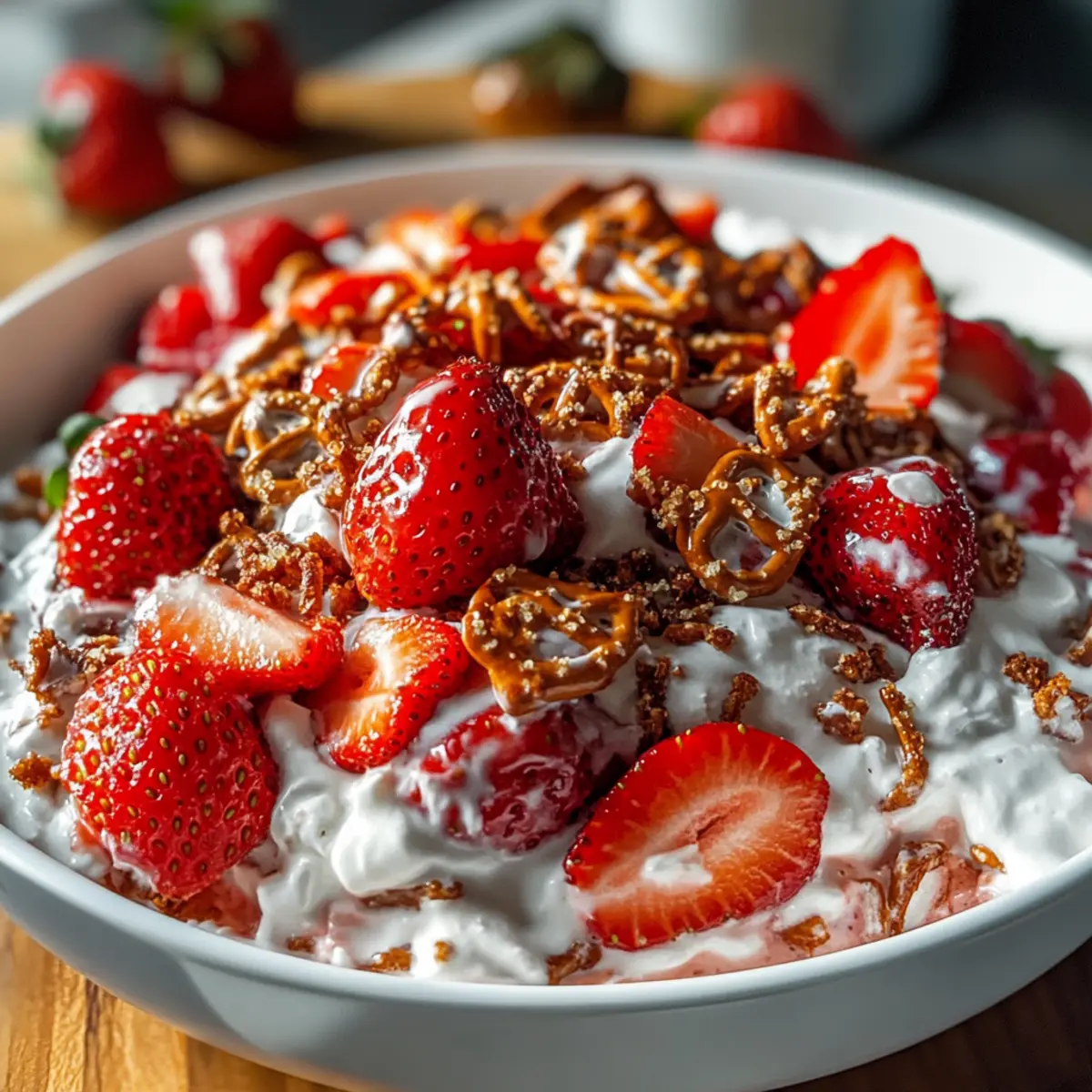 Just before you’re ready to serve, slice the fresh strawberries into bite-sized pieces and gently fold them into the chilled cream cheesy mixture. Add half of the pretzel crunch at this stage, stirring carefully to maintain the lightness of the salad. This will make your Strawberry Crackle Salad burst with vibrant color and flavor.