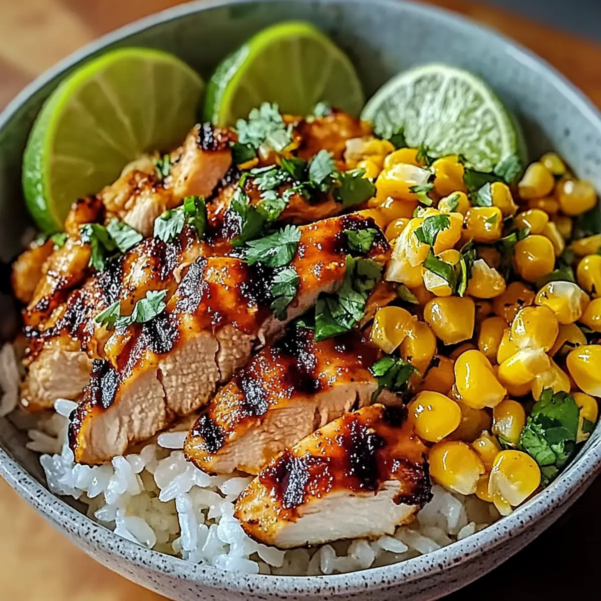 5. Assemble the Bowls: Start with rice, layer grilled chicken, street corn mix, and add garnishes like cilantro, avocado, and jalapeños.