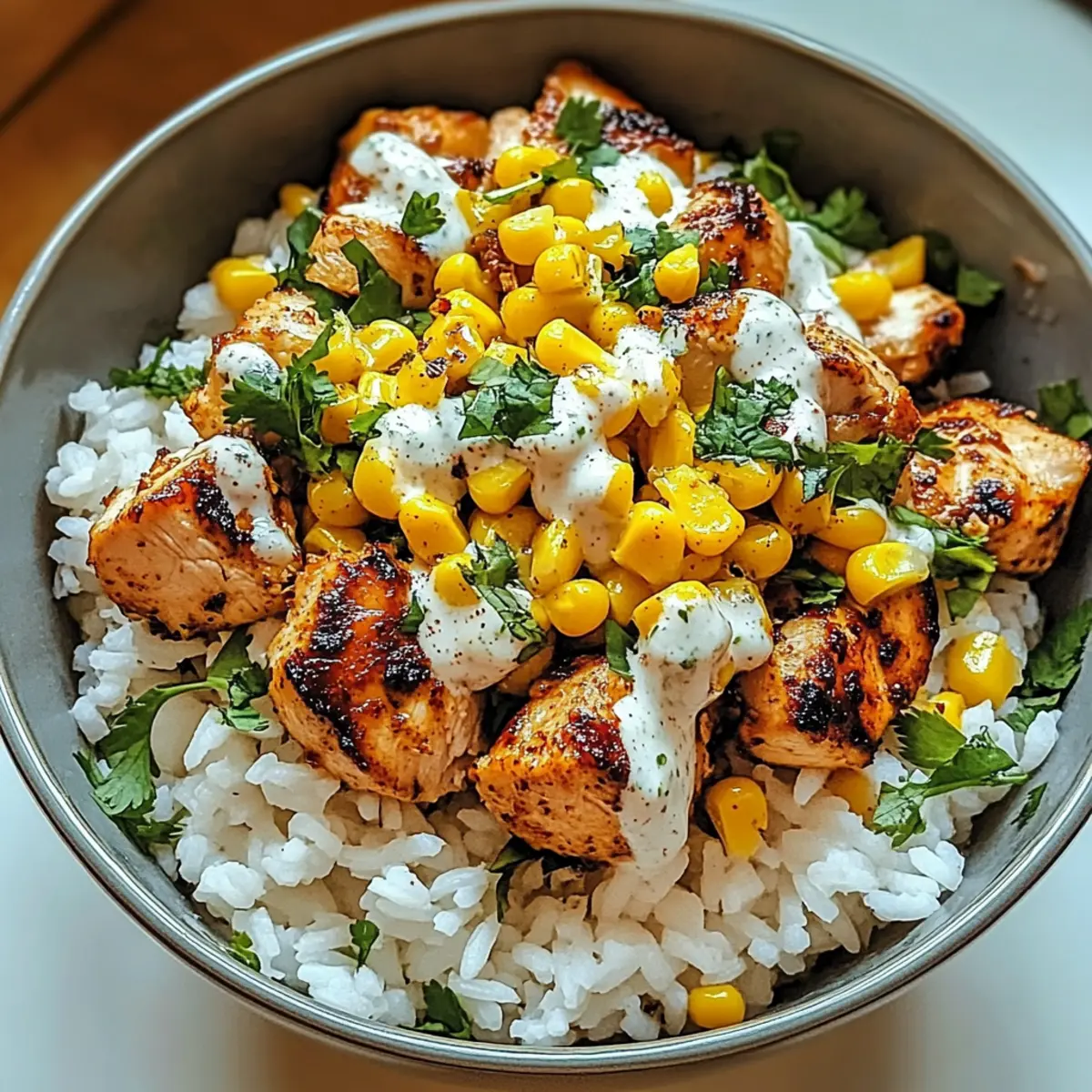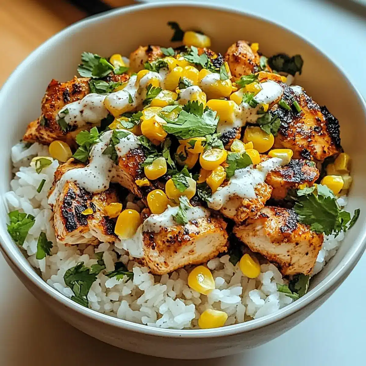 - Assemble the bowl by layering warm rice, sliced chicken, and corn mixture on top.