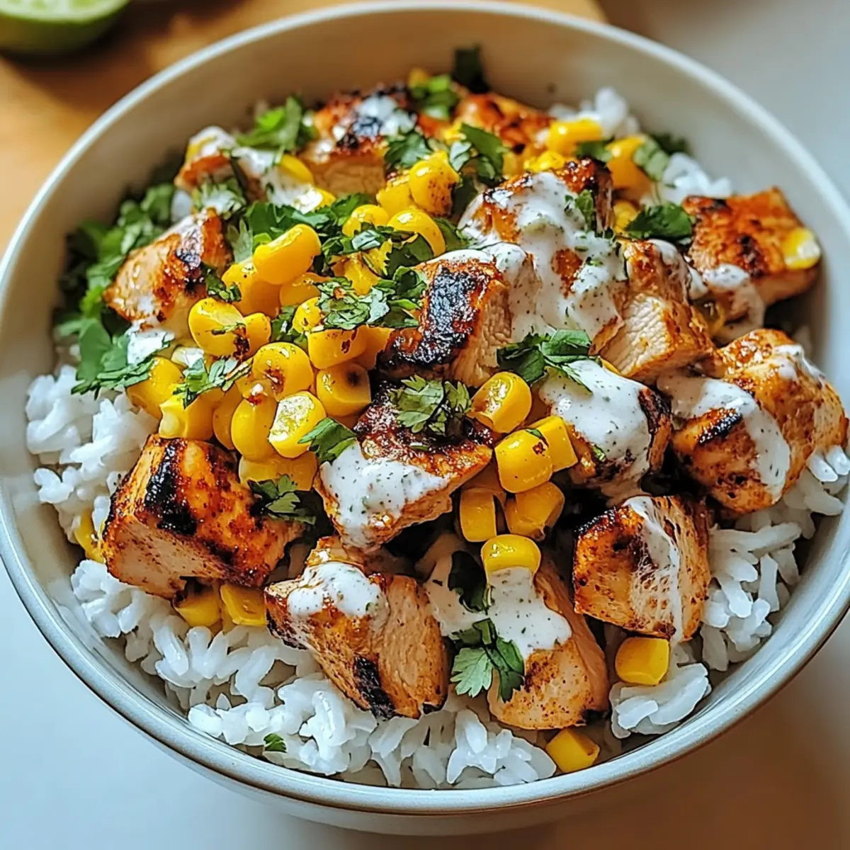 In the same skillet used for the chicken, add the sweet corn over medium-high heat. Sauté for about 5 minutes until the corn is slightly caramelized and fragrant. Stir in the cream (or Greek yogurt), lime juice, and additional chili powder, blending well. Cook for another 1-2 minutes until everything is heated through, creating a creamy corn topping for the rice bowl.