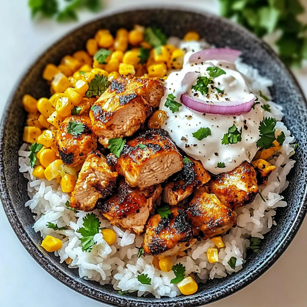 Experience the vibrant flavors of the Street Corn Chicken Rice Bowl, combining juicy chicken thighs with smoky charred corn and zesty lime sauce.