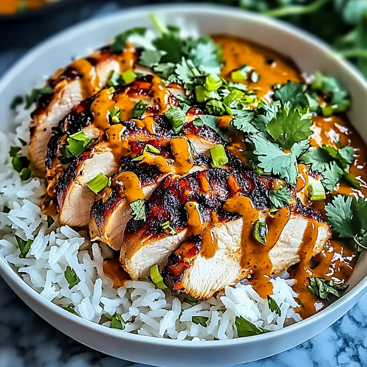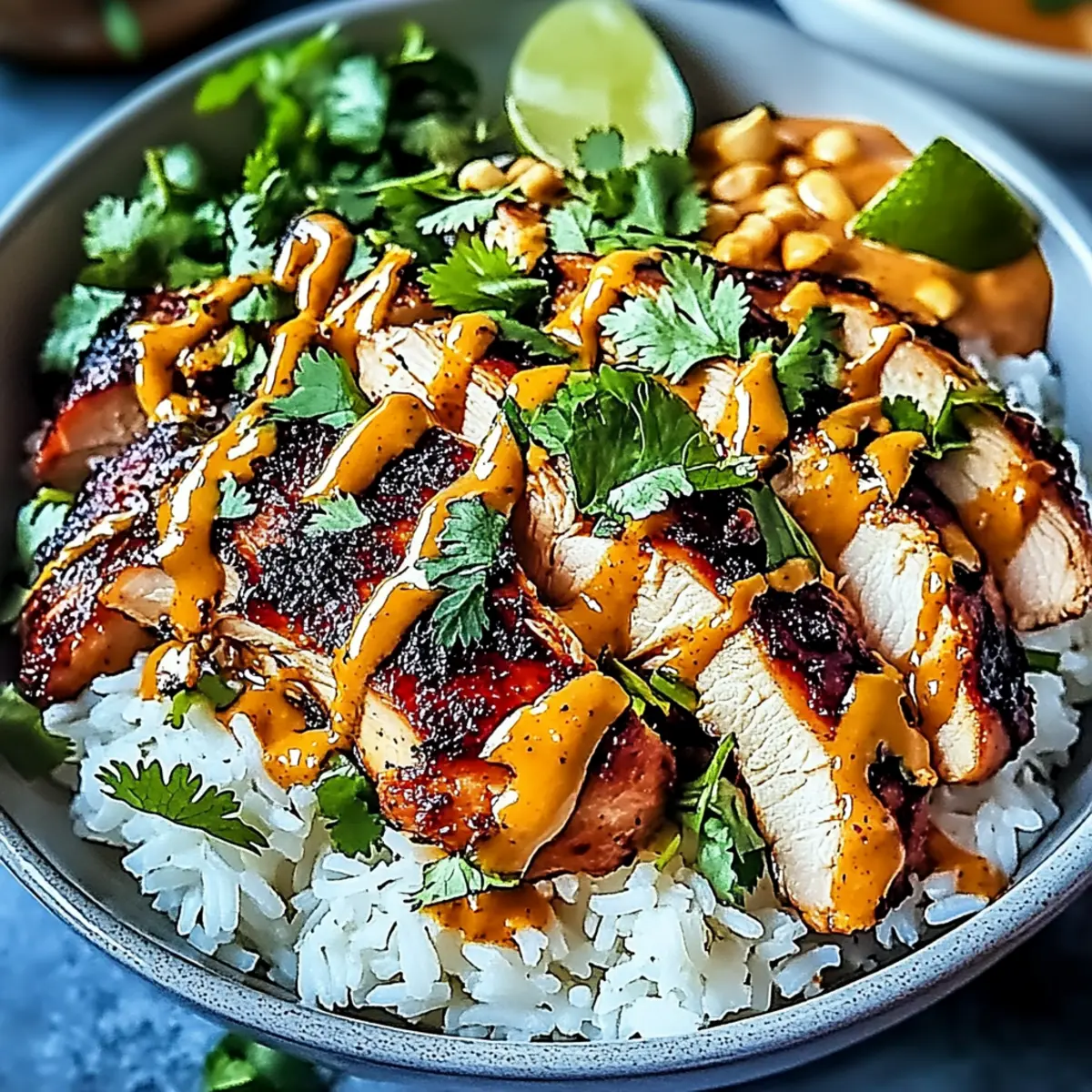 - In each bowl, add a generous scoop of fluffy cooked white rice as the base. Layer the freshly sliced chicken on top, allowing the vibrant colors to shine through. Drizzle with creamy peanut or sesame sauce for added richness, and scatter fresh cilantro over the top for a pop of color and freshness.