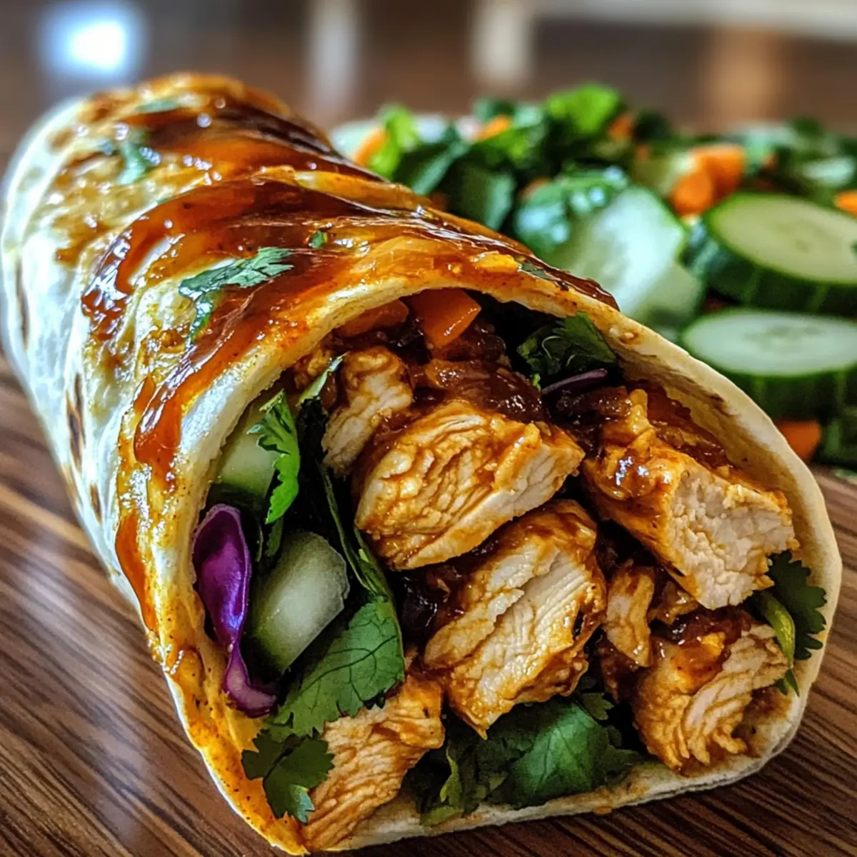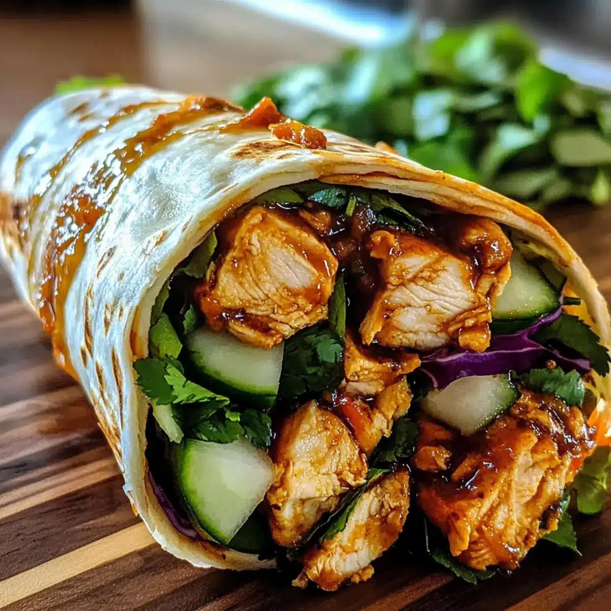 - Assemble the Wraps: Spread creamy sauce on the tortilla, layer with fresh vegetables, and add glazed chicken.