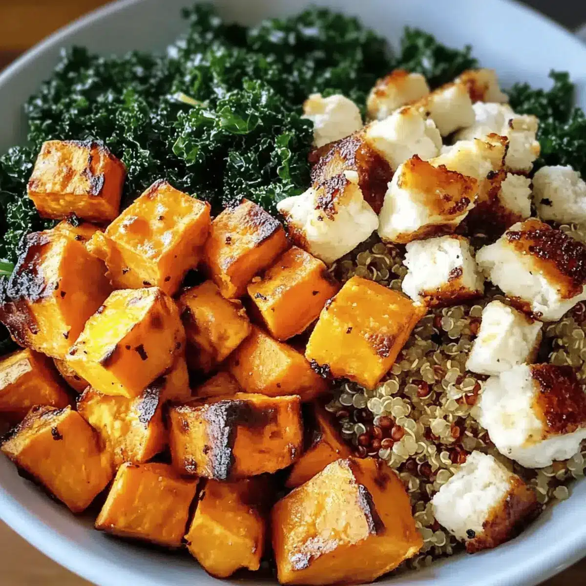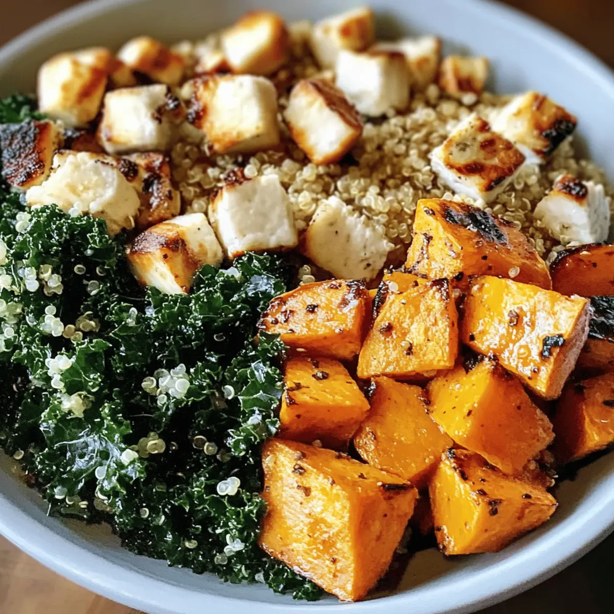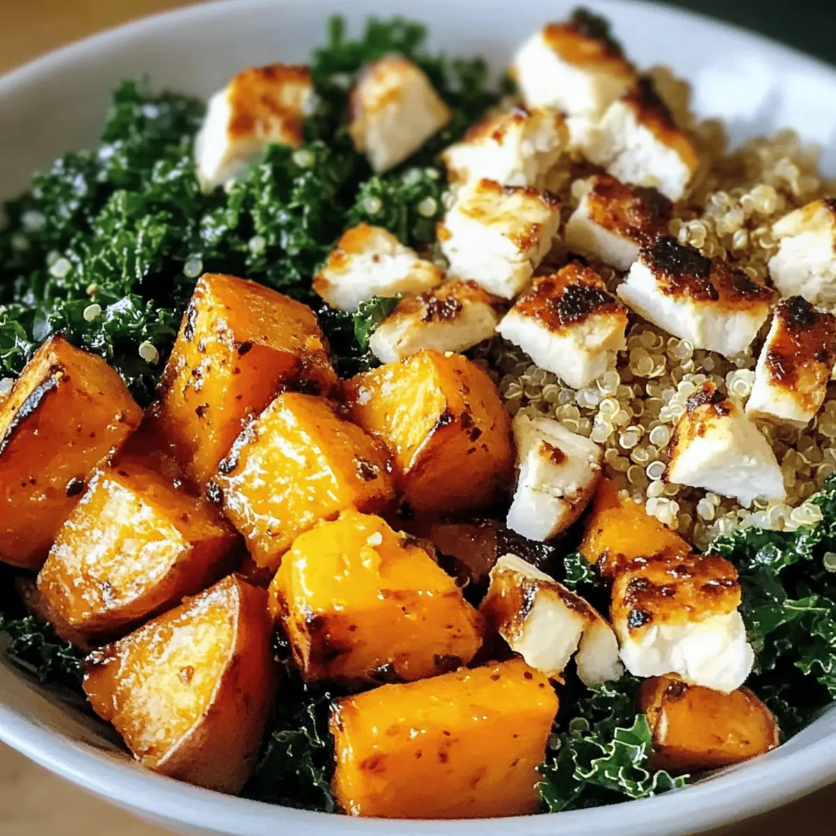 - Assemble the bowls: layer with warm quinoa, roasted sweet potatoes, protein, and massaged kale.