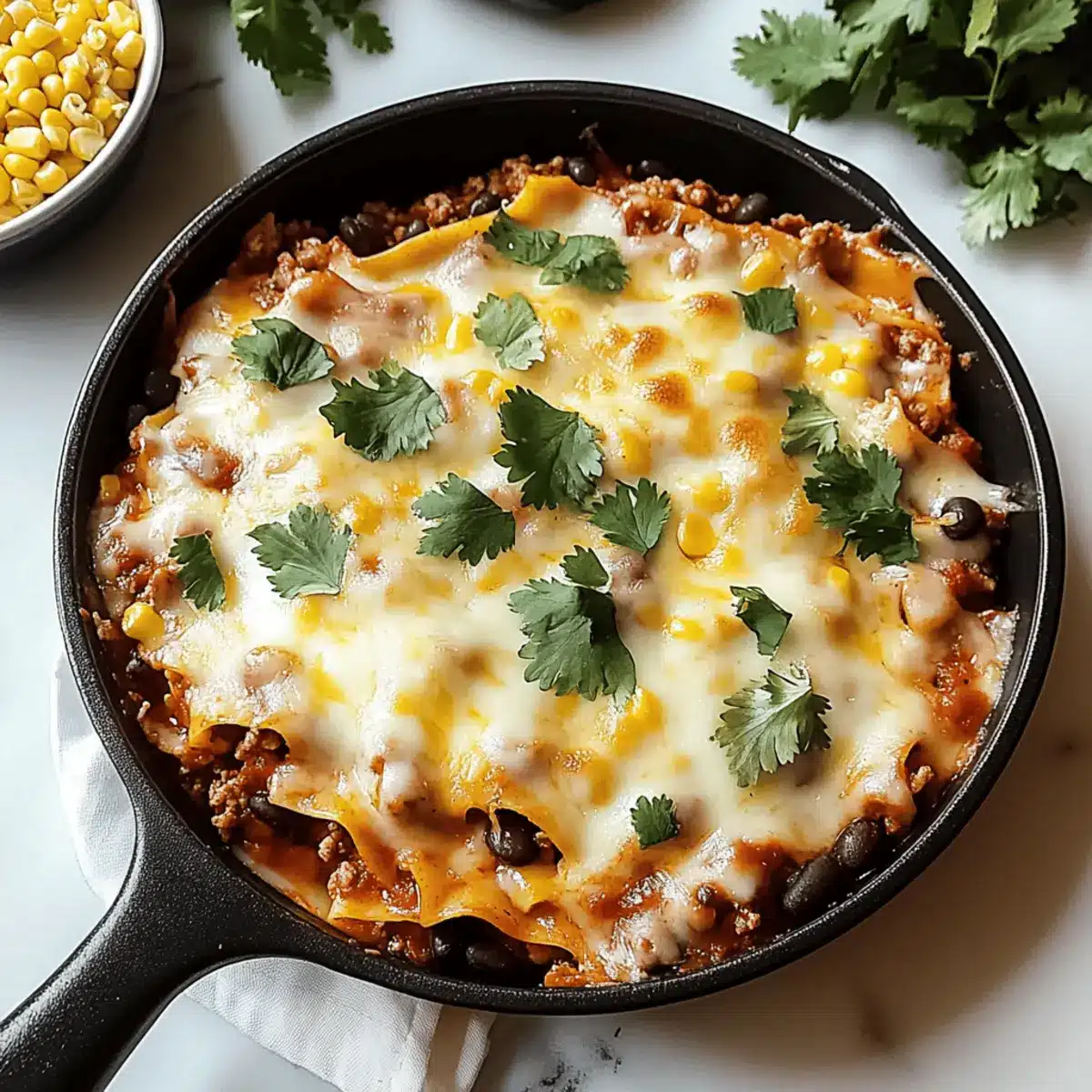 Generously sprinkle shredded cheddar and Monterey Jack cheese over the bean and corn layer. The cheese will melt beautifully, creating that gooey, comforting texture that makes Taco Lasagna such a family favorite.