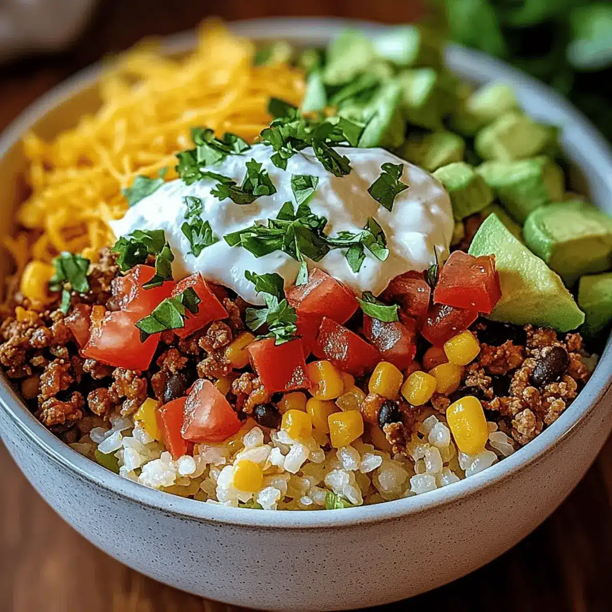 Reheating: To reheat, warm the Taco Rice Bowl in the microwave or on the stovetop over medium heat until heated through, about 5–7 minutes. Add fresh toppings just before serving for the best taste.